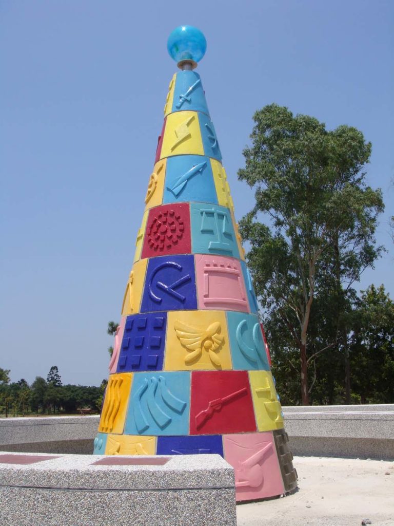 《展翅飛翔》/田邊武/耐候性鋼板、景觀石、花崗石/雕塑 《像太陽致敬》/蕭勤/壓克力彩、畫布/畫作 《玫瑰騎士》/董振平/不銹鋼、彩色玻璃鑲嵌、圓石/雕塑 《智慧之塔》/劉鎮州/陶瓷、玻璃球/雕塑 《紀律與榮耀》/蔡文慶/白色大理石、黑花崗石/雕塑 《跨越》/余宗杰/大理石/雕塑